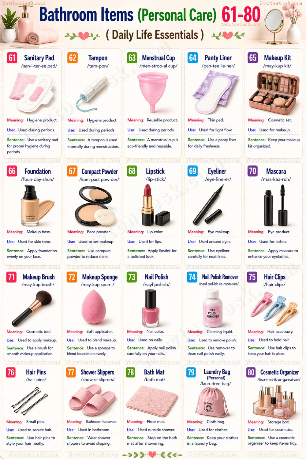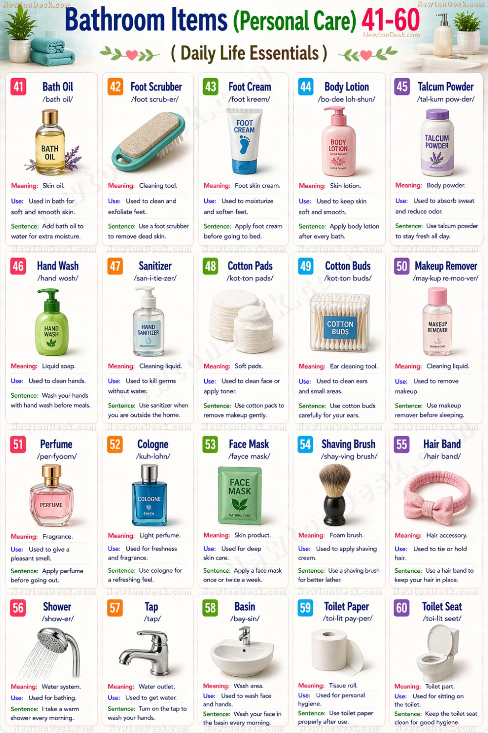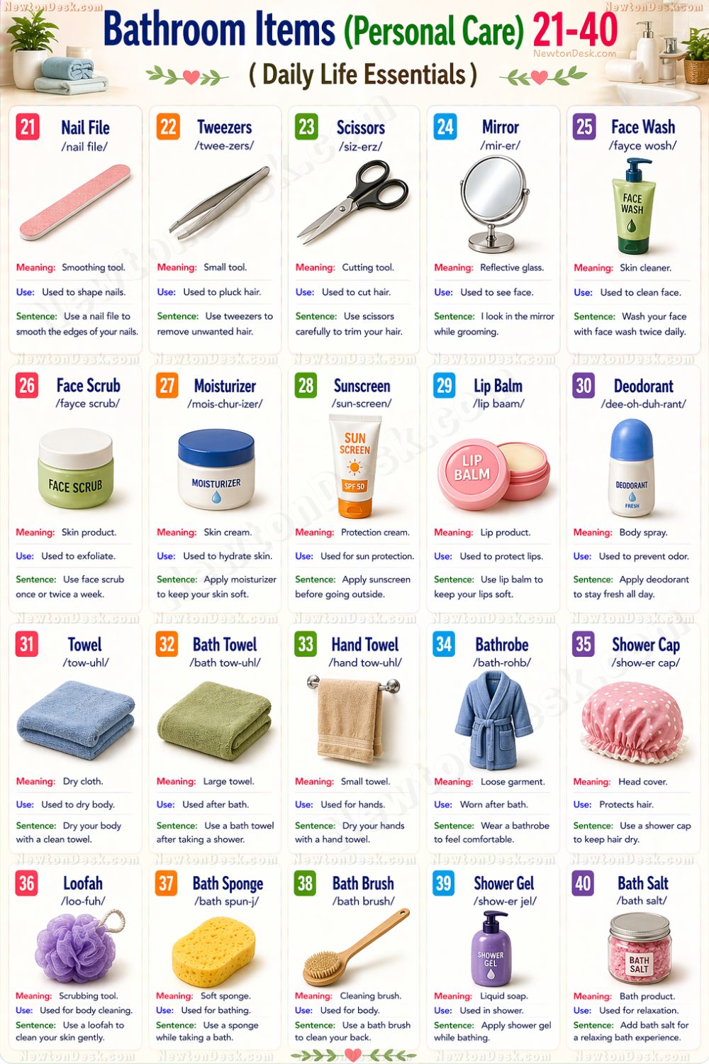 Bathroom items are things we use every day for cleaning, grooming, and personal care. Learning these words helps you speak English in daily life easily. In this guide, you will learn 100 bathroom items names in English with meaning, pronunciation, and simple sentences. This is perfect for beginners.