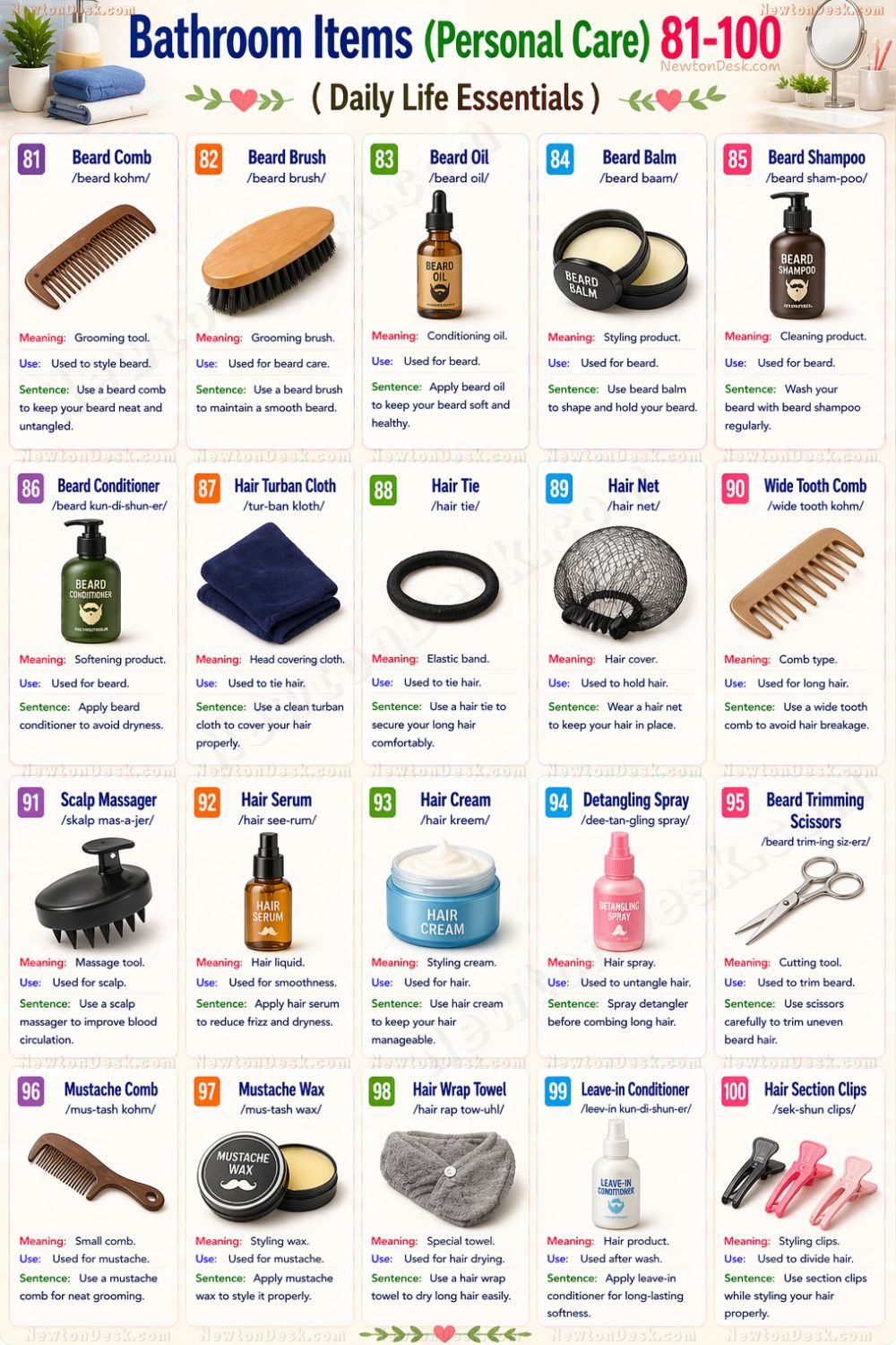 These words help in advanced daily English conversations. Items like beard oil, hair serum, and detangler spray are used for grooming. Hair clips and combs help style hair.