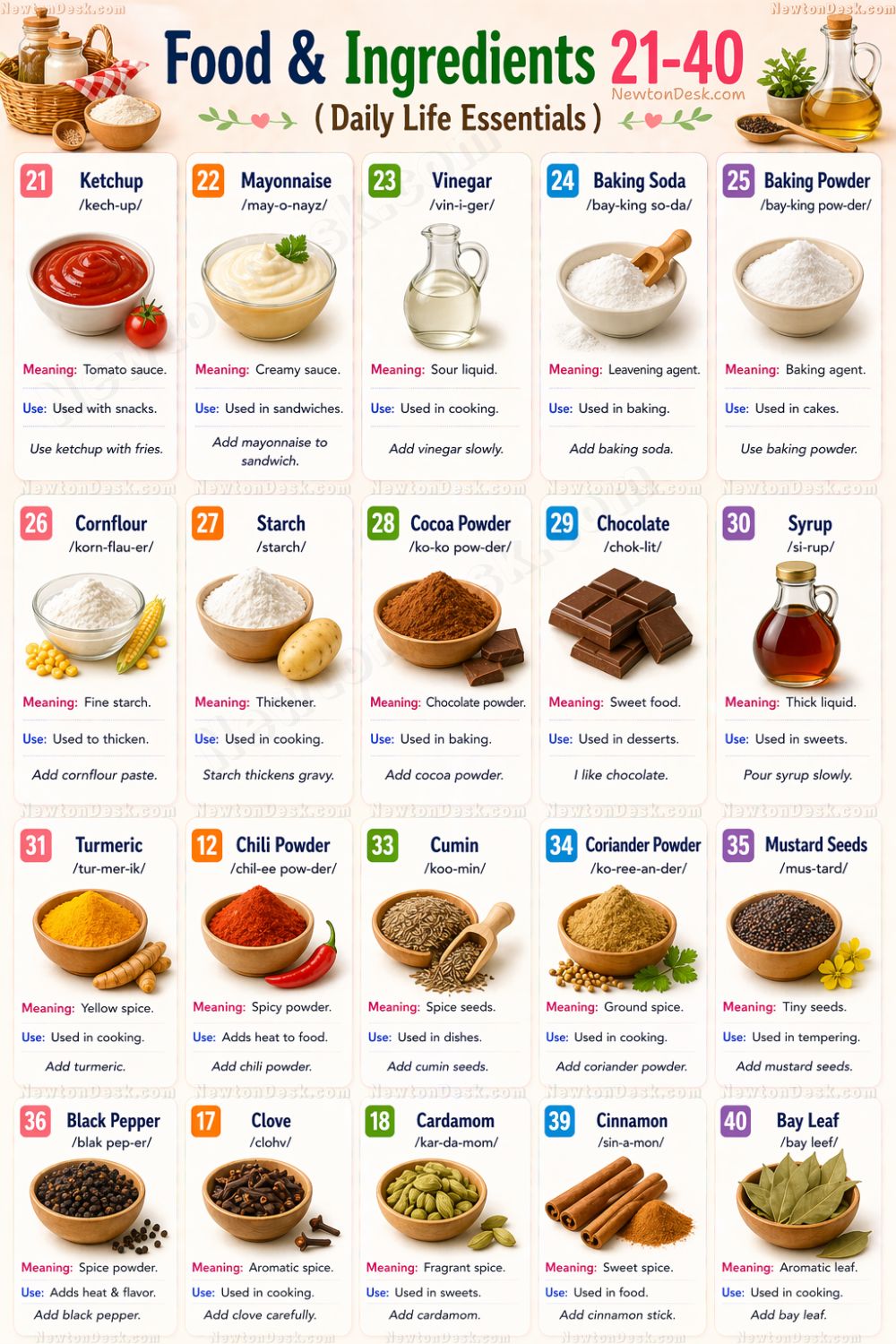 Ingredients like ketchup, mayonnaise, and sauce are used with snacks. Vinegar is used in cooking and salads. Baking soda and baking powder are used for baking cakes. Cocoa powder and chocolate are used in desserts. Spices like turmeric, chili powder, cumin, and coriander add flavor to food. Black pepper, clove, cardamom, cinnamon, and bay leaf are used in cooking. These ingredients are used daily in kitchens and help you describe food preparation in English.