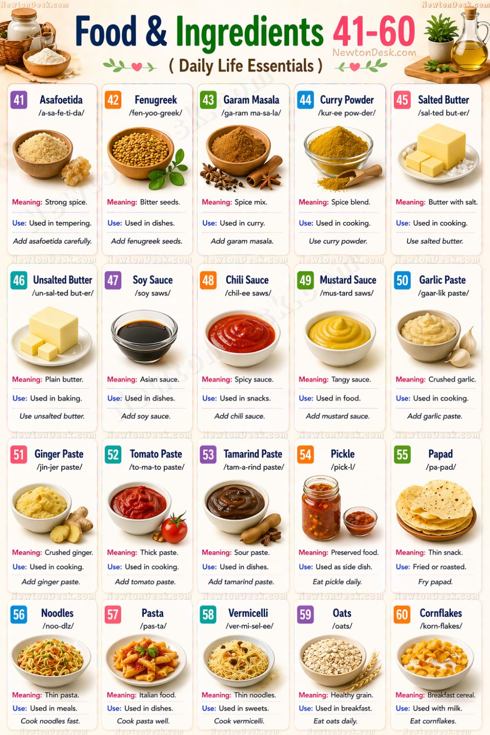 Practice these food vocabulary words daily. Use them while eating and cooking. Save these infographics for revision and share them with others to learn faster.