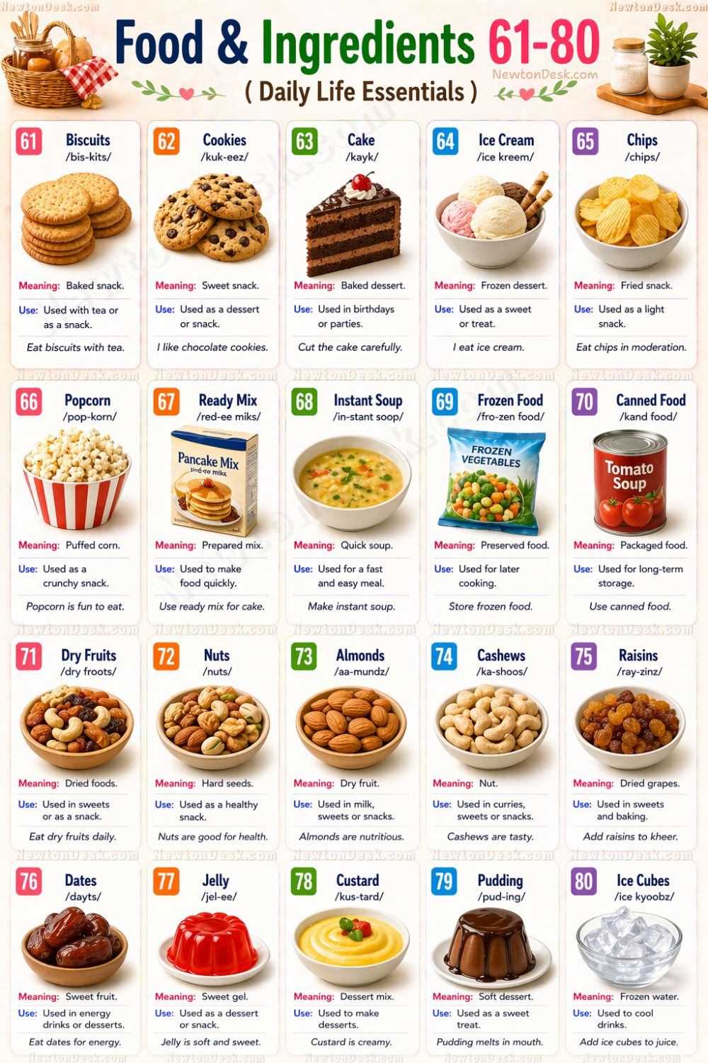 Try making simple sentences using these words. For example: “I eat biscuits with tea” or “Cashews are healthy.” Snacks like chips and popcorn are eaten for fun. Desserts like cake, ice cream, pudding, and custard are sweet treats. Dry fruits like almonds, raisins, and dates are healthy snacks. Speaking these sentences daily will improve your English fluency.