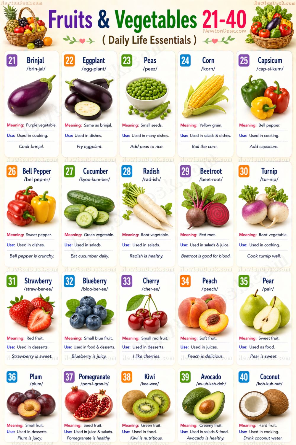 Vegetables like brinjal, peas, corn, and cucumber are used in cooking and salads. Fruits like strawberry, blueberry, cherry, and peach are used in desserts and juices. These items are common in markets and kitchens. You can use these words when talking about food, shopping, or cooking in English.