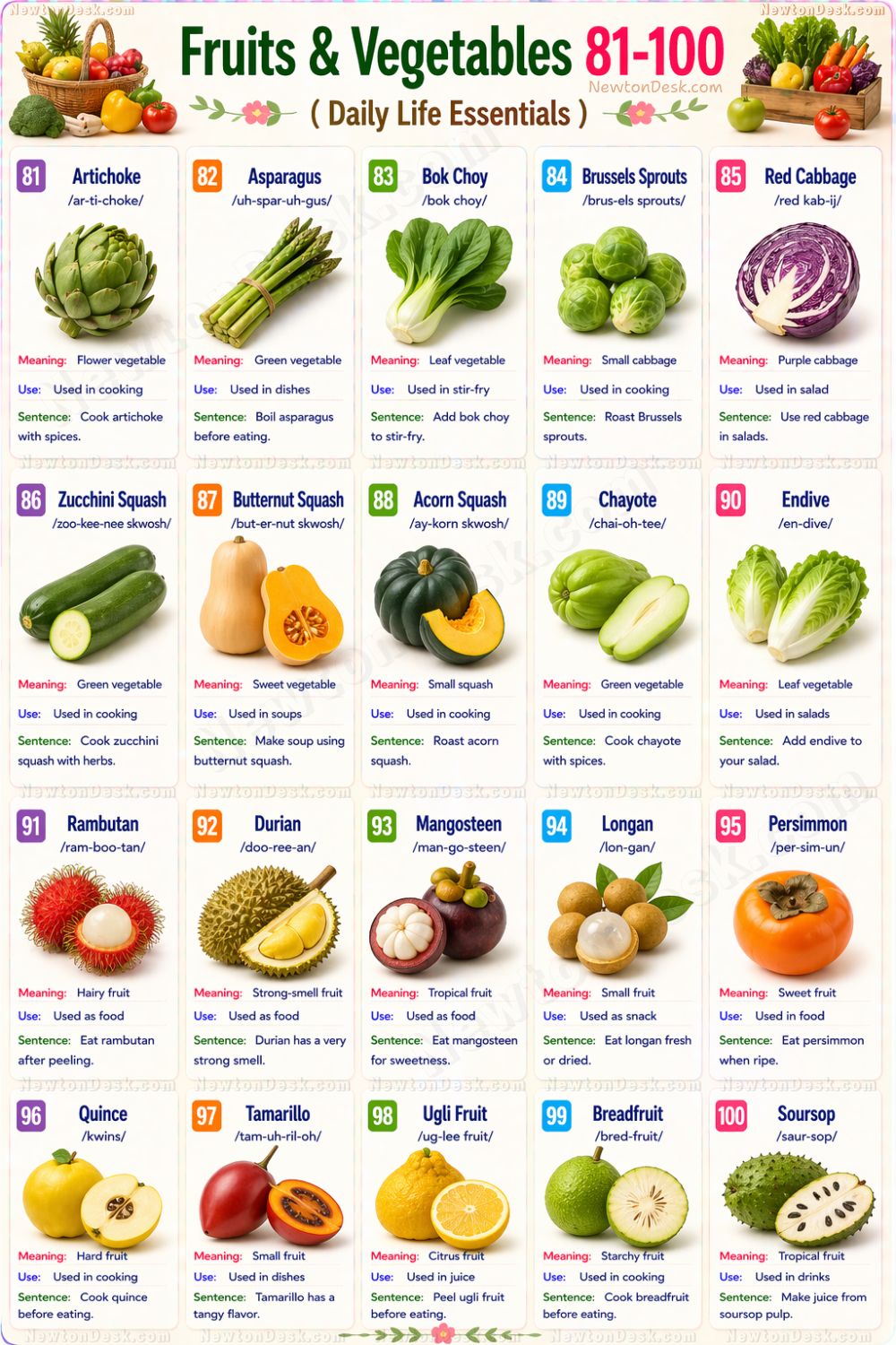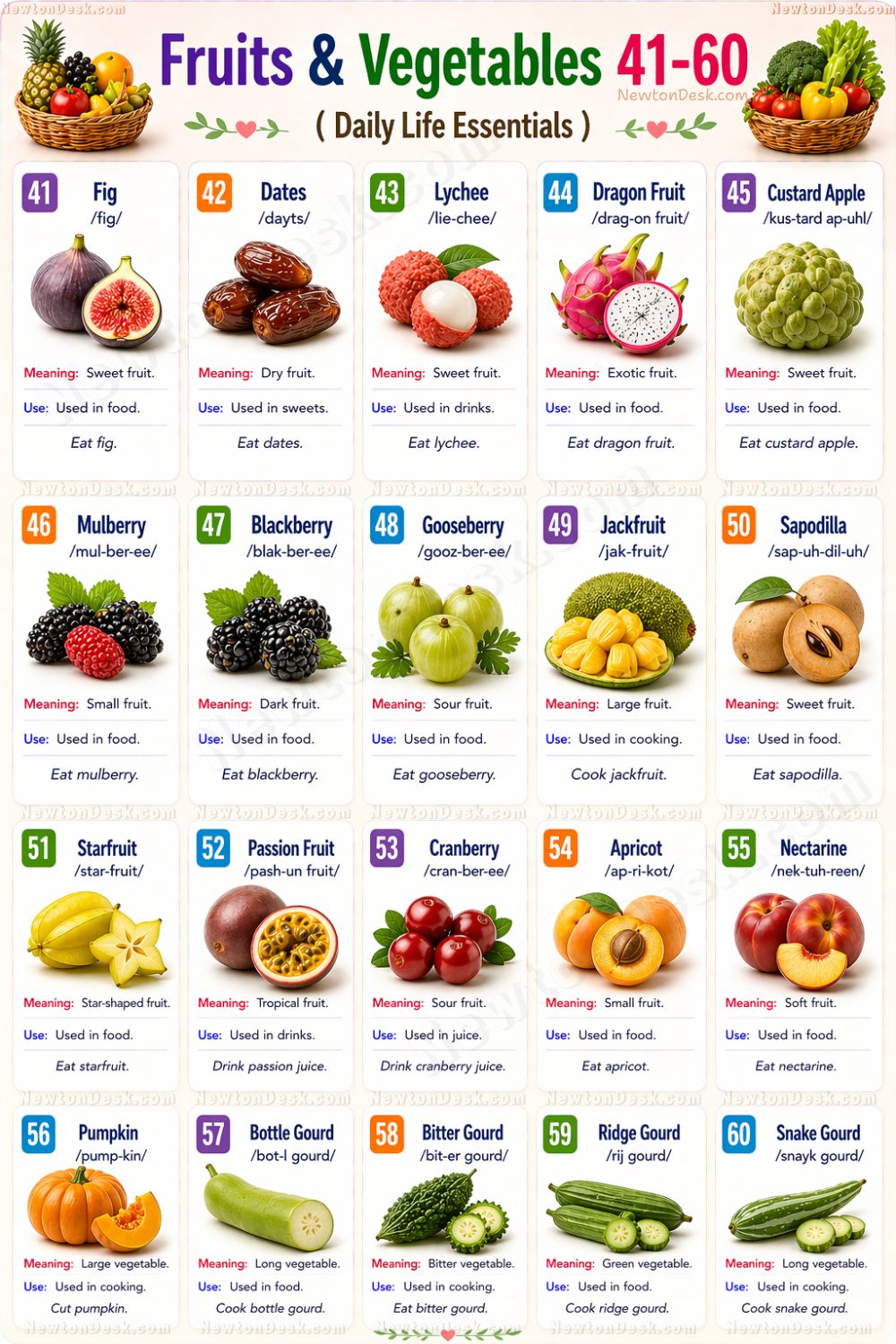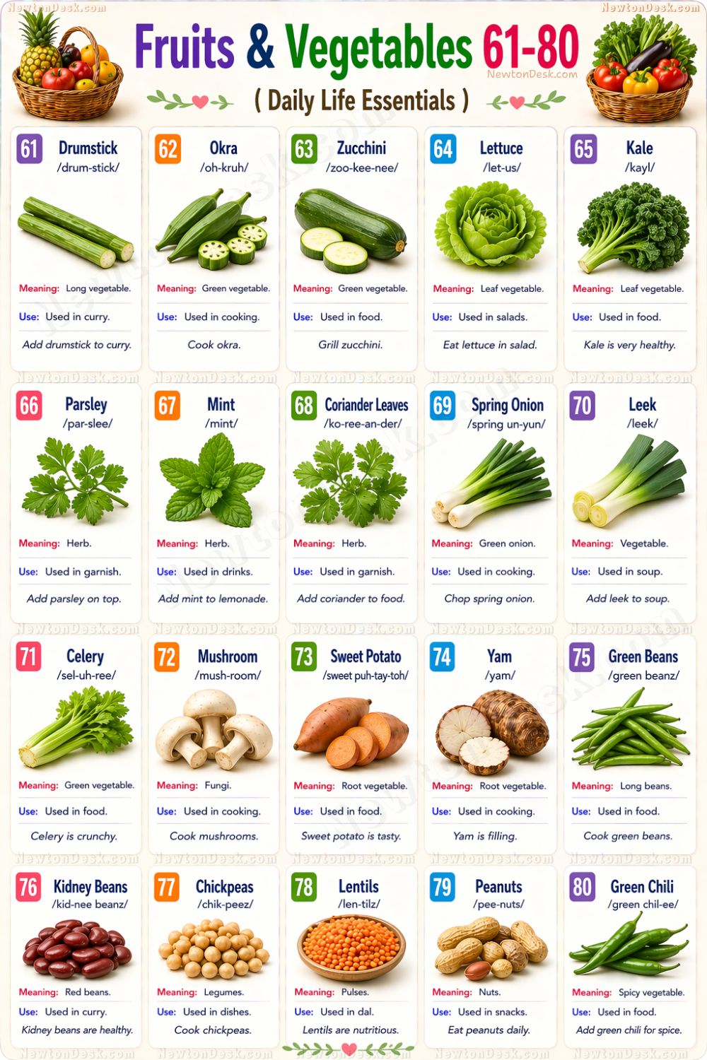 Fruits and vegetables are part of daily life, so learning their names in English is very important. In this guide, you will learn 100 fruits and vegetables names in English with meanings and simple examples. This helps beginners and students improve daily English speaking.