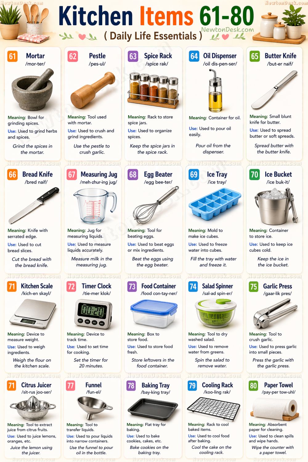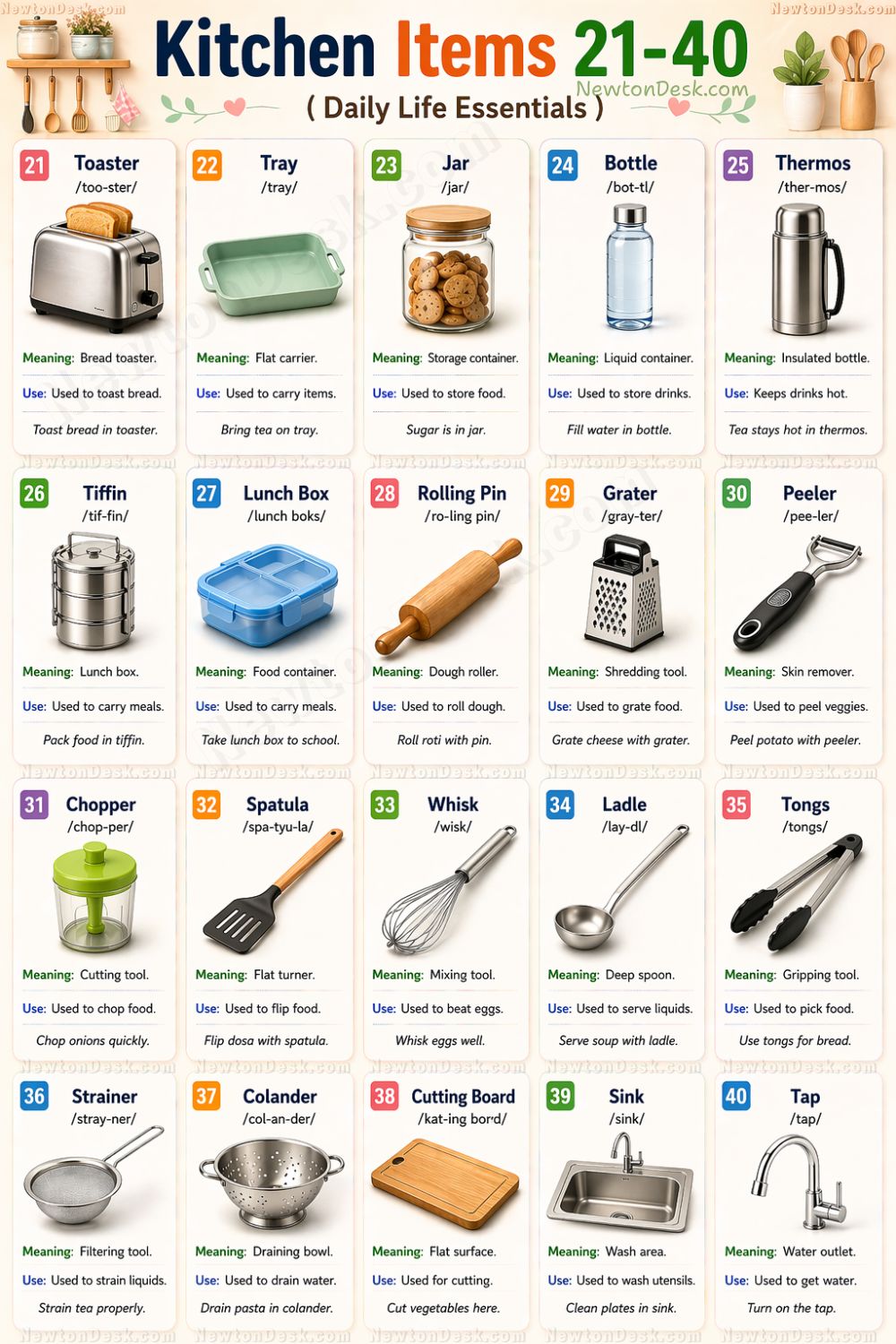 Kitchen items 41 to 60 names with meaning and sentences